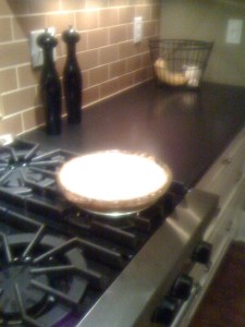 Here’s the thing – you should always READ THE RECIPE first. I just read as we went. Four hours later, I’m still trying to finish out this pie, which I’ve grown to loathe. After about hour three, I found myself talking to it: “You’d better be good, you little smirky pie! You know, I might even get a spoon and eat you right now. Stop giving me that smug look with your crust all golden brown. You just WAIT until tomorrow. I am going to eat you so fast.”