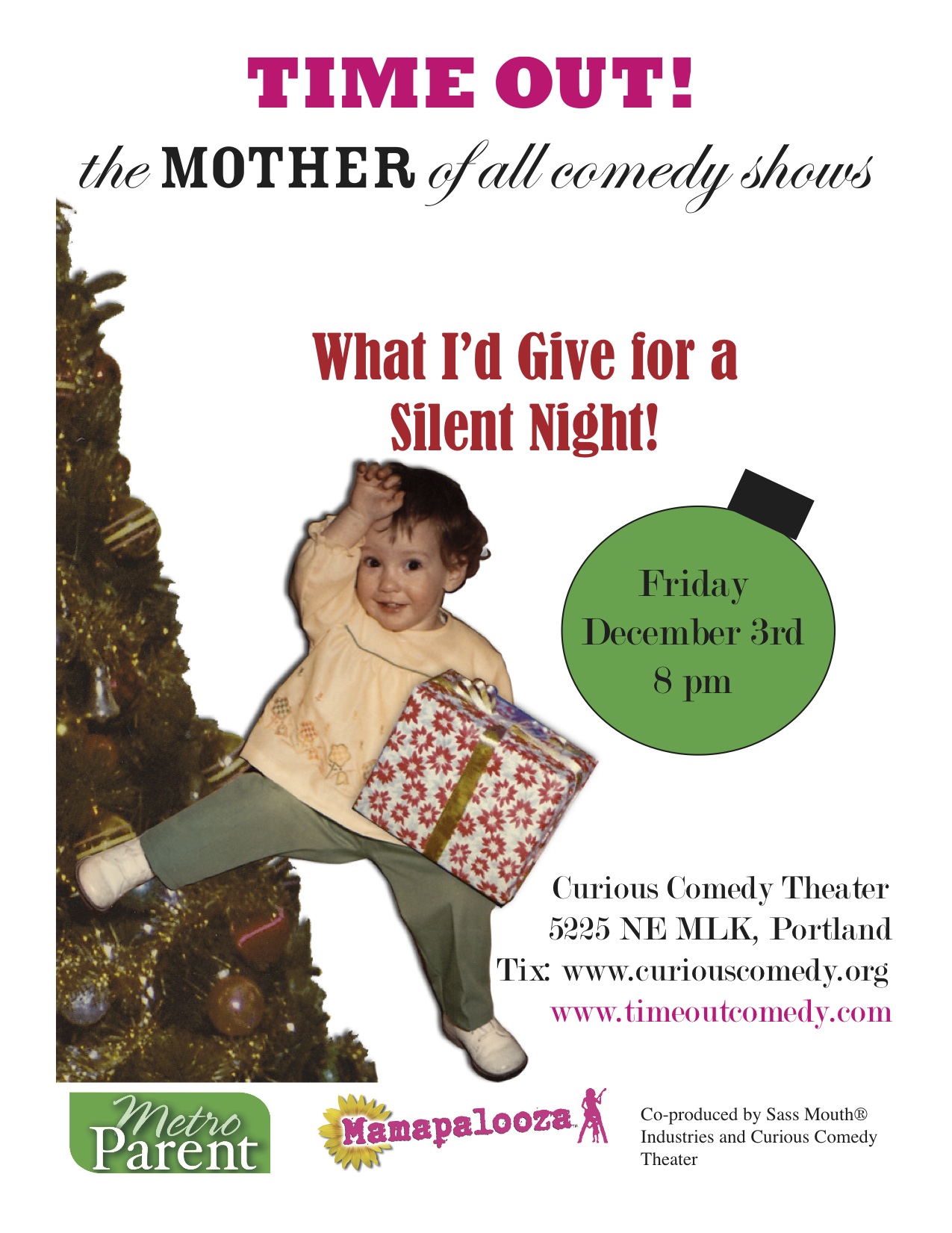 In other news – show this Friday, Dec. 4th! “What I Would Give for a Silent Night” 8 pm at Curious Comedy Theater. Word on the street is the tickets are starting to go – so come on, come on! I’m hosting this time. Hope to see you there.