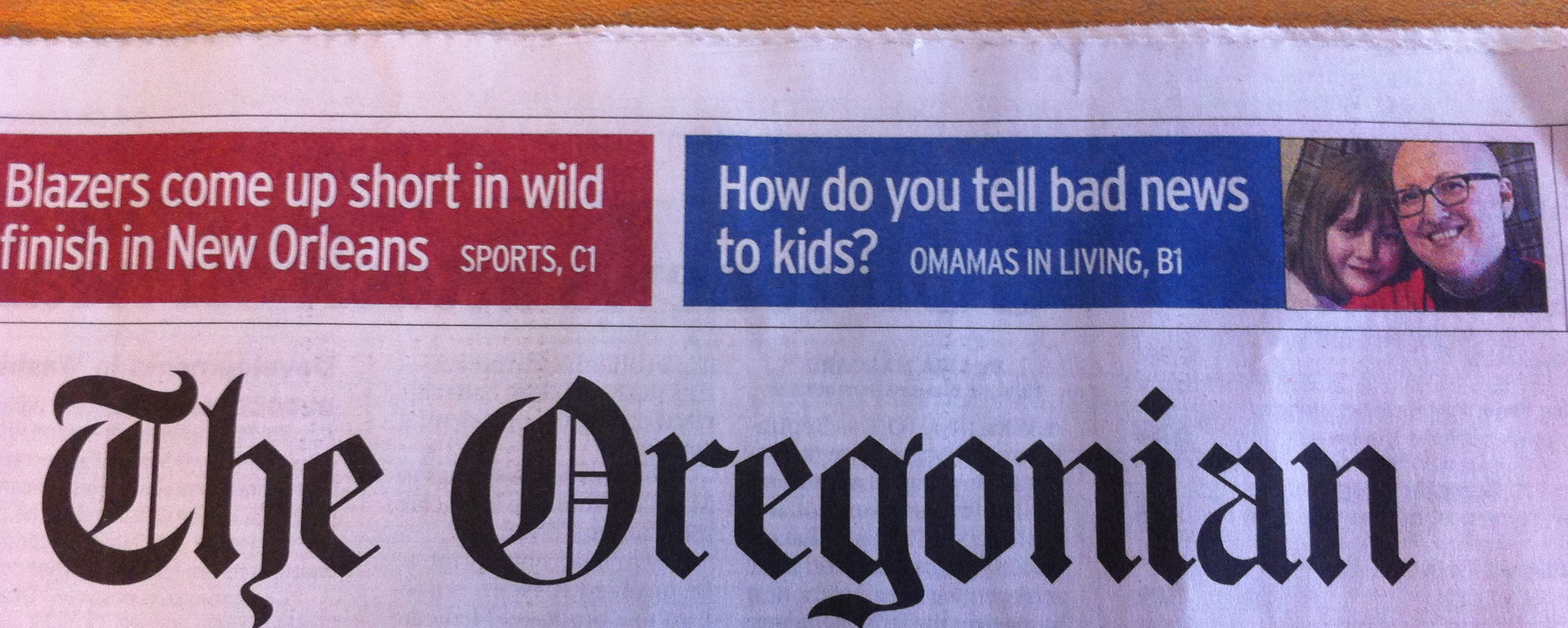 They could have said no, but they didn’t when I asked if they minded if I told our story to The Oregonian: http://www.oregonlive.com/kiddo/index.ssf/2013/03/when_parents_have_cancer_tips.html It’s totally honest – and personal. My kids still wanted to do it. All day, I worried. Would kids at school make fun of them? It turned out the opposite. Steven’s teacher brought in a copy of the paper, and Steven talked to the class about it. When he finished, his class applauded. While I was walking our dog Xena, another mom said the article will help her talk to her kids. She just got diagnosed as well. I told her I was so sorry to have her in the cancer “club.” It’s the kind of club you wish had no members. Anyway, thanks Steven and Livvie for being brave enough to let your crazy mother share your story. Hoping this article will help other kids.