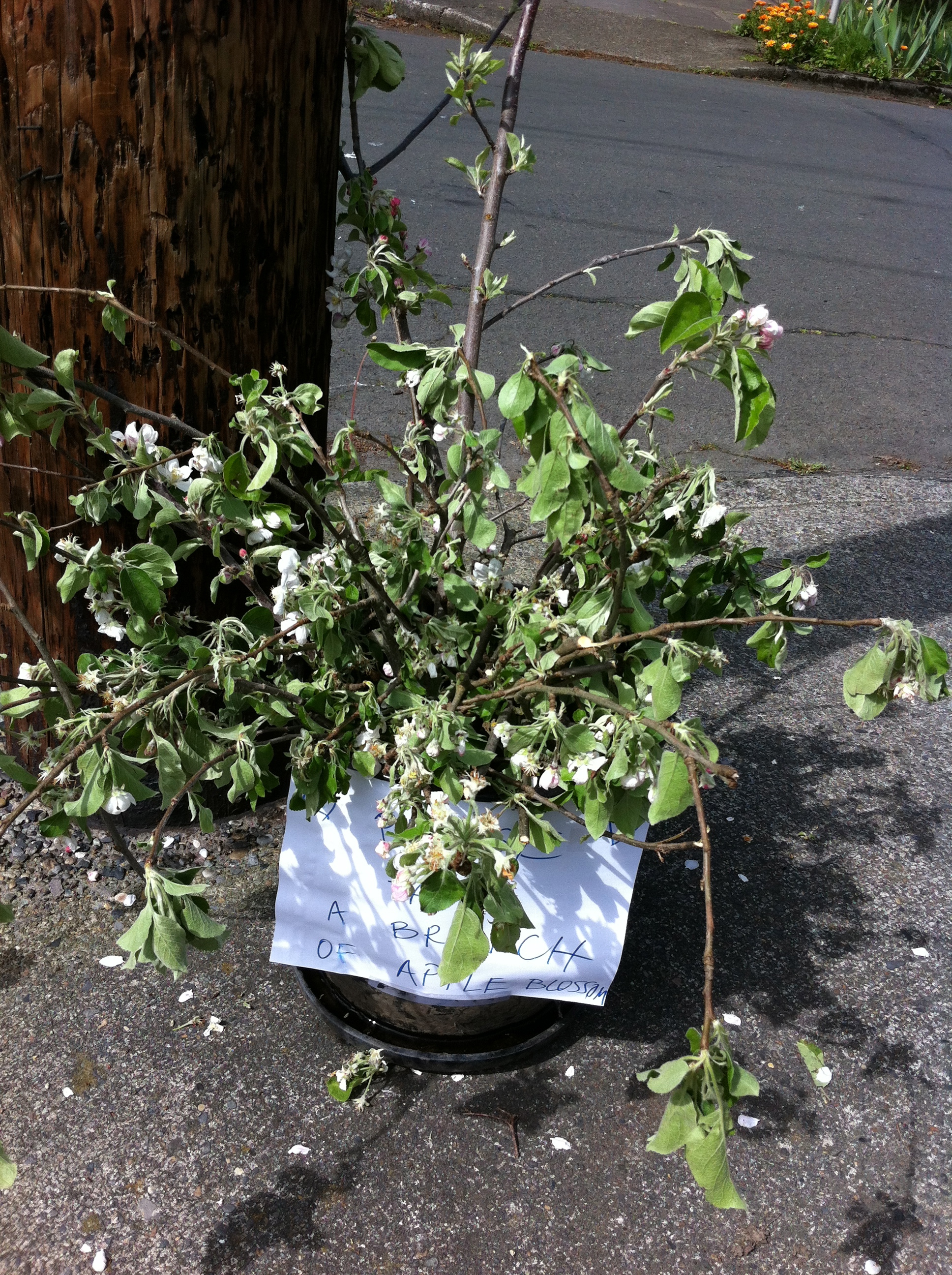 1- Took Xena the Warrior Princess Dog for a walk and ran across this – a pot of apple blossoms with a happy note inviting passers-by to take one. I love living here.